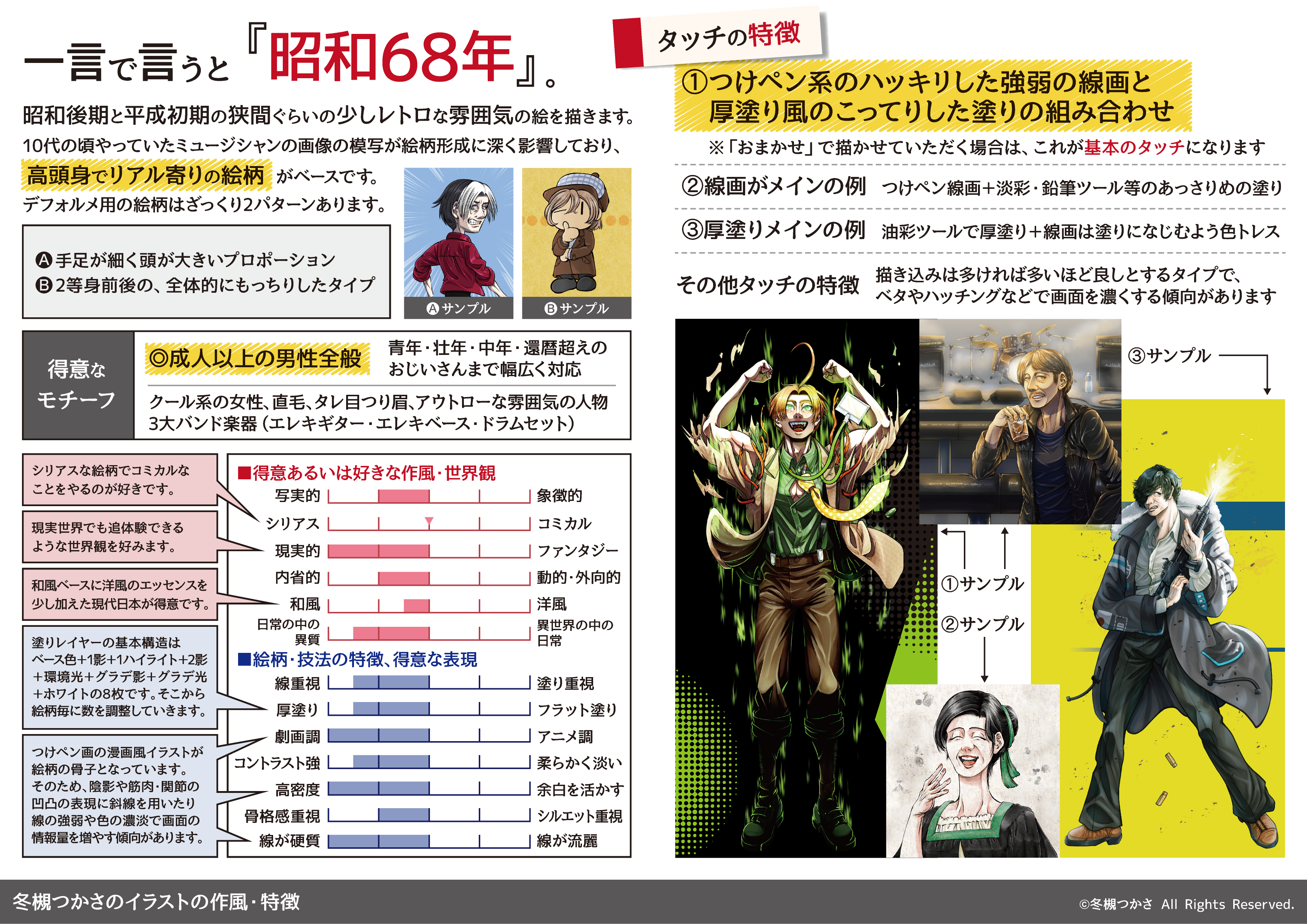 私の作風やイラストの特徴・得意分野などは、こちらのページも併せてご覧下さい。