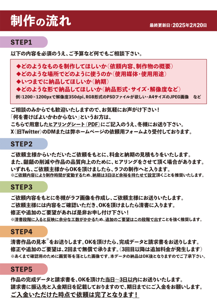 上記リンク先よりPDF(A4サイズ)をダウンロードいただき、必要項目を入力のうえで送信用フォームに添付いただくとイメージ共有がスムーズにできます。